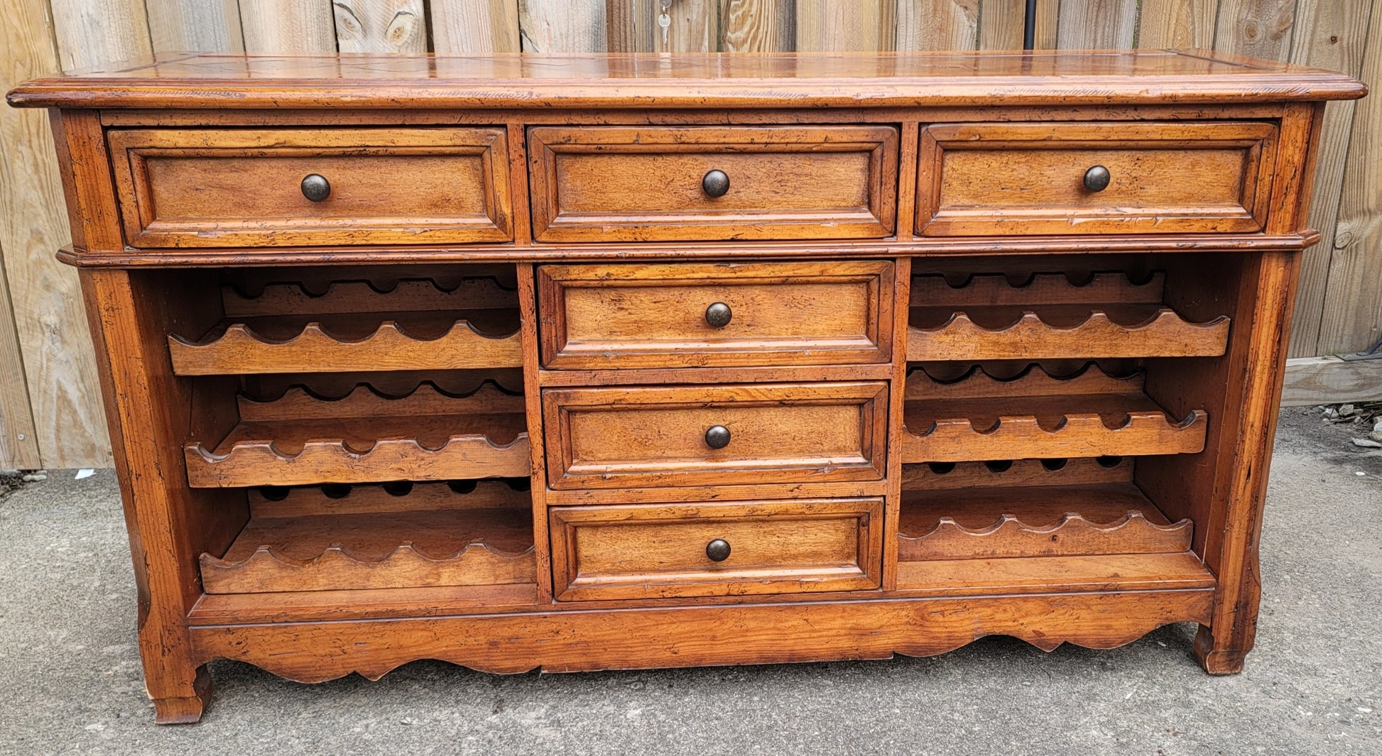 This beautiful vintage wine cabinet by Baker is the perfect addition to your rustic farmhouse décor. With its warm brown color and six spacious shelves and 6 drawers, it provides ample storage for your favorite wines. The cabinet is made of high-quality wood and has a height of 32 inches, a length of 18 inches, and a width of 60 inches. No designer mark was found.The antique-inspired design and post-1950 time period manufactured provide a unique touch to your home. The wine cabinet is from Honduras and has a charming, rustic/primitive style that fits perfectly into any farmhouse-style home. Whether you're entertaining guests or enjoying a quiet evening at home, this wine cabinet is sure to impress.Condition is subjective. As with all antique and vintage furniture unless noted as mint condition, some imperfections and dings noted are consistent with age. But I like to say, it tells a story. Please zoom in on the pictures and ask questions prior to purchasing. Please allow 30-45 business days for delivery.